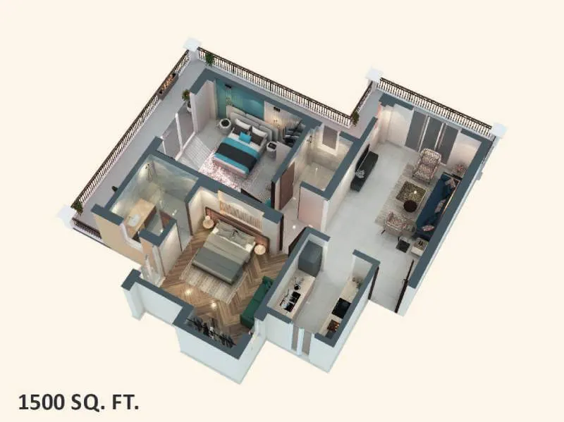 2 Bedrooms 1 Modular Kitchen Large Living + Dining Room 1–2 Balconies 2 Bathrooms (master with imported marble vanity) Utility area