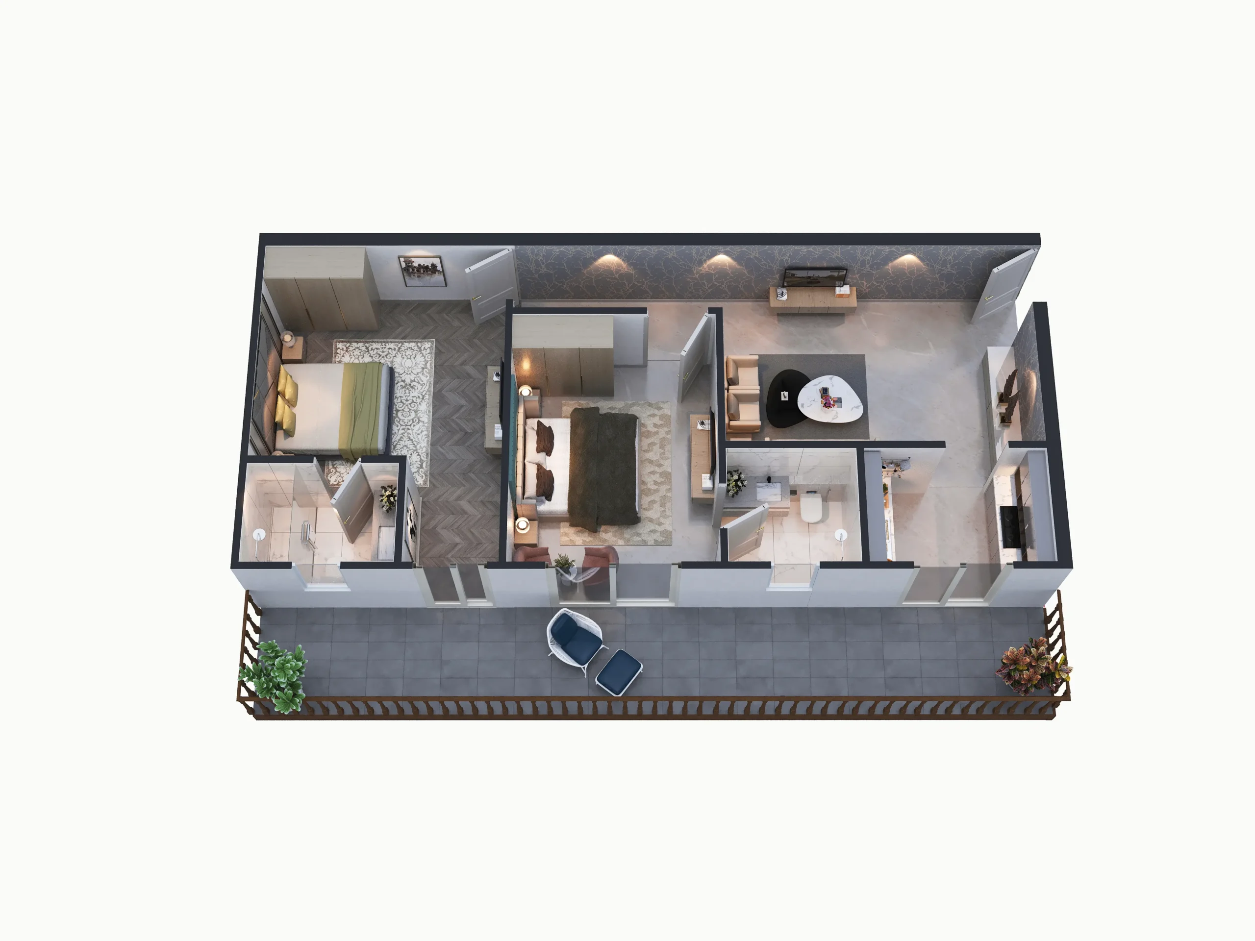 2 Bedrooms 1 Modular Kitchen Spacious Living + Dining 1–2 U-Shaped Balconies 2 Premium washrooms