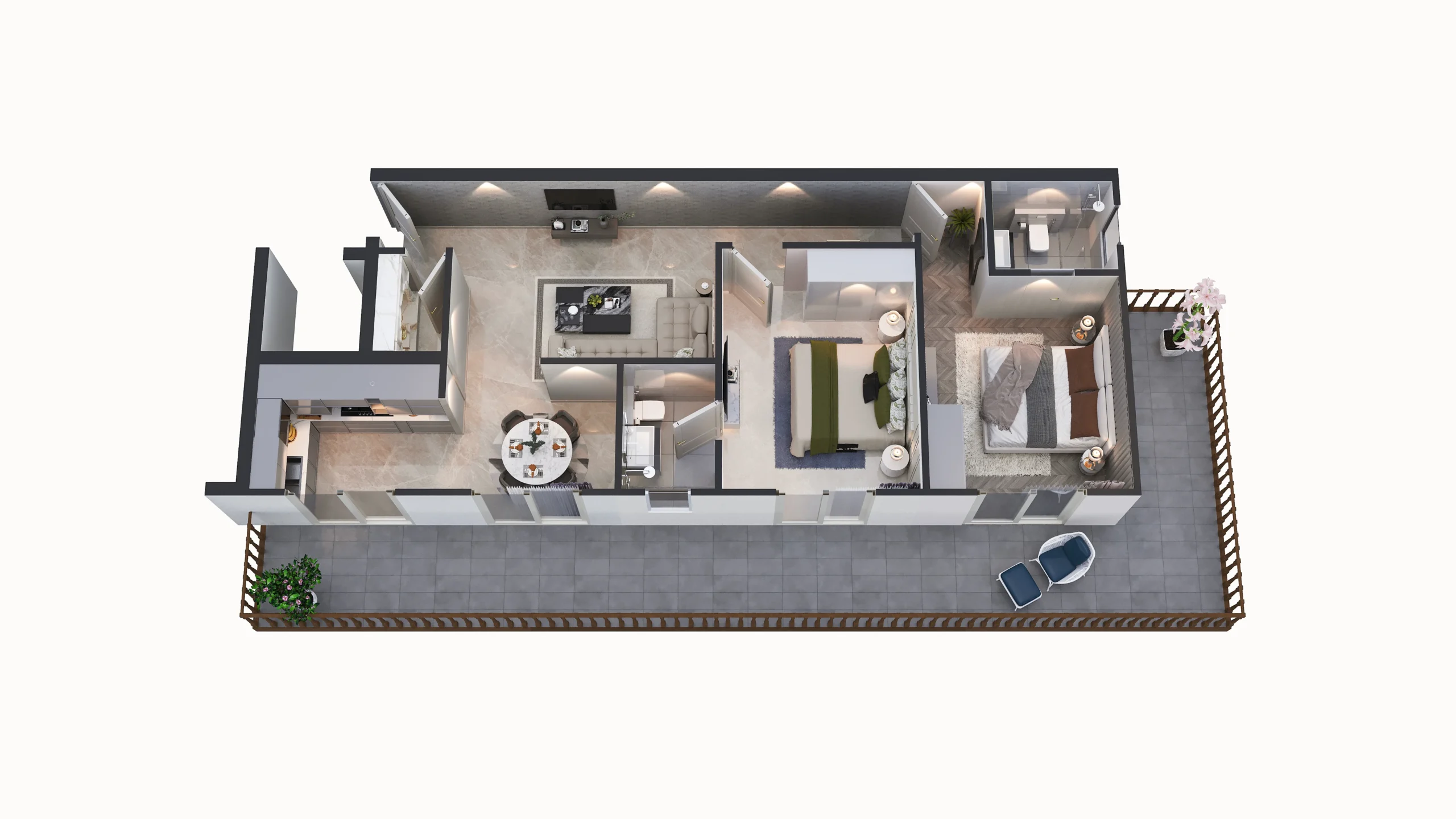 2 Bedrooms 1 Modular Kitchen Spacious Living + Dining 1–2 U-Shaped Balconies 2 Premium washrooms